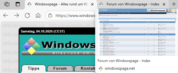 Der Browser zeigt eine kleine Registerkartenvorschau (Inhalt der Registerkarte) an, wenn der Benutzer mit der Maus bzw. dem Mauszeiger über eine inaktive Registerkarte fährt. Auf der Einstellungs-Seite "Tabs" unter "Darstellung" ("edge://settings/appearance/tabs") kann ein Benutzer die Tabvorschau über die Option "Anzeigen der Tabvorschau beim Draufzeigen" ein- oder ausschalten.